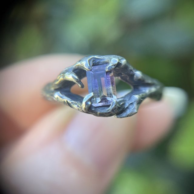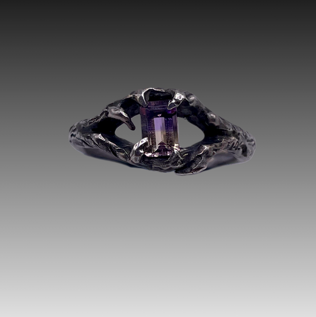 The Ametrine Tree Nymph ring, hand carved in wax and cast in solid sterling silver. This one of a kind design was sculpted around this rare gemstone, unveiling its unique beauty which is held in place by gnarly, organic textured twigs. Finished with a black patina which emphasise the colours of the octagon cut Ametrine and creates a beautiful gothic fairytale ring π§π»ββοΈππ