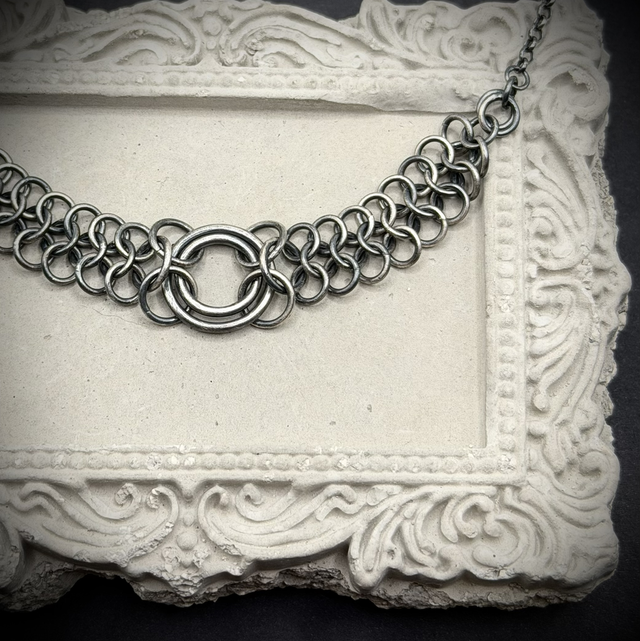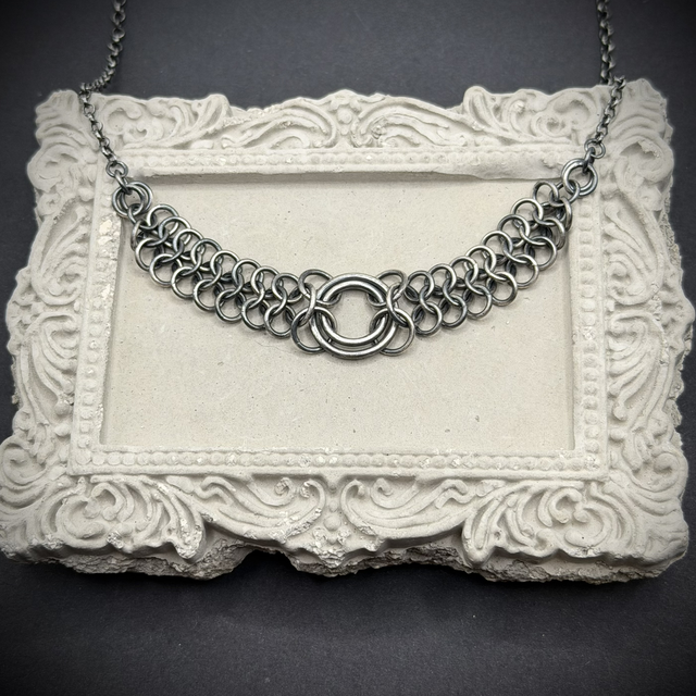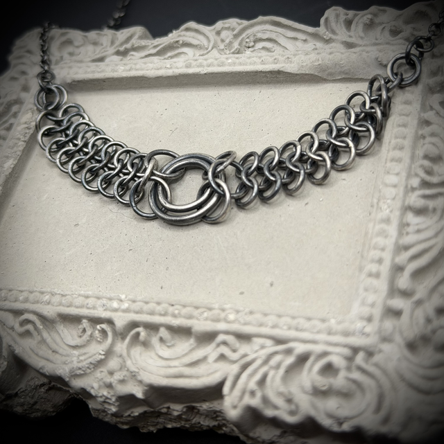 Hand woven sterling silver chainmail necklace, oxidised to emphasise a dark, gothic aesthetic and replicate the original iron used in medieval chainmail.