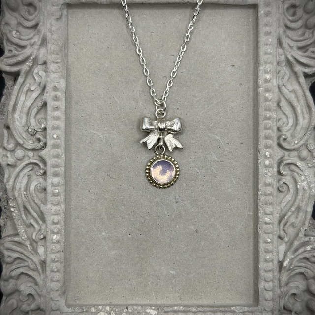 Suspended from a dainty bow charm is a mesmerizing rose cut lavender quartz stone with a decorative beaded frame. This unique gemstone shimmers enchanting pastel hues of purple, blue, pink with fiery golden undertones, complemented beautifully by the high shine silver.